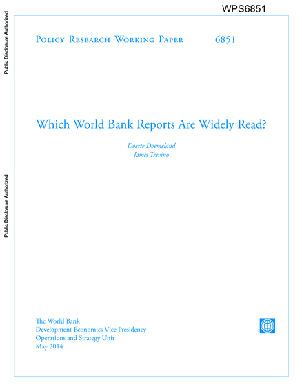 "About 49 percent of the World Bank’s policy reports, which are published Economic and Sector Work or Technical Assistance reports, have the stated objective of informing the public debate or influencing the development community. This study uses information on downloads and citations to assess whether policy reports meet this objective. About 13 percent of policy reports were downloaded at least 250 times while more than 31 percent of policy reports are never downloaded. Almost 87 percent of policy reports were never cited. More expensive, complex, multi-sector, core diagnostics reports on middle-income countries with larger populations tend to be downloaded more frequently. Multi-sector reports also tend to be cited more frequently. Internal knowledge sharing matters as cross support provided by the World Bank’s Research Department consistently increases downloads and citations." (Abstract)