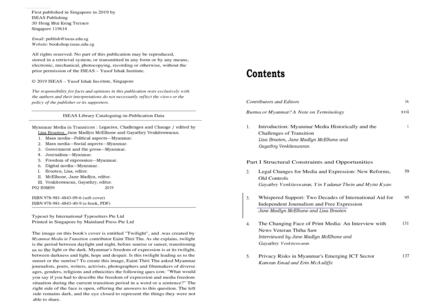 "This chapter is drawn primarily from Jane Madlyn McElhone's thirteen years of in-field experience in Myanmar and other nations in transition, as well as key informant interviews she conducted in 2017 and 2018 [...] Our discussion is driven by a series of interlinked questions. Who were the key media development actors during the time of the military junta, what kind of support did they offer, and who benefited from it? What were the assumptions driving the aid? With hindsight, what are the lessons learned that can be applied to Myanmar's contemporary media development sector, and to regional and international media development efforts? What is the legacy of the many years of pre-transition aid? What have we learned from the response to the Rakhine crisis?" (Pages 96-97)