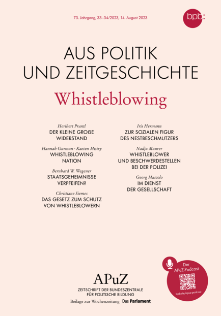 "Das gezielte Aufdecken geheimer Informationen durch Insider („Whistleblowing“) wird innerhalb von Unternehmen, Organisationen und Behörden oft kritisch gesehen, die Enthüllung von Staatsgeheimnissen häufig sogar strafrechtlich verfolgt. Auch demokratische Rechtsstaaten tun sich schwer mit Whistleblowern und ihrem Tun. In fast allen Mitgliedsstaaten der Europäischen Union gibt es mittlerweile sogenannte Hinweisgeberschutzgesetze, mit denen eine entsprechende EU-Richtlinie zum Schutz von Whistleblowern in nationales Recht umgesetzt wird. Nicht nur das deutsche Umsetzungsgesetz nimmt dabei die Weitergabe von Geheiminformationen, die wesentliche Sicherheitsinteressen des Staates berühren, von diesem Schutz aus." (https://www.bpb.de)