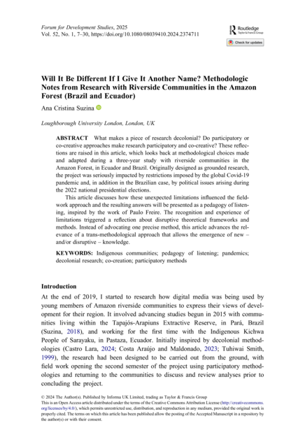 "What makes a piece of research decolonial? Do participatory or co-creative approaches make research participatory and co-creative? These reflections are raised in this article, which looks back at methodological choices made and adapted during a three-year study with riverside communities in the Amazon Forest, in Ecuador and Brazil. Originally designed as grounded research, the project was seriously impacted by restrictions imposed by the global Covid-19 pandemic and, in addition in the Brazilian case, by political issues arising during the 2022 national presidential elections. This article discusses how these unexpected limitations influenced the fieldwork approach and the resulting answers will be presented as a pedagogy of listening, inspired by the work of Paulo Freire. The recognition and experience of limitations triggered a reflection about disruptive theoretical frameworks and methods. Instead of advocating one precise method, this article advances the relevance of a trans-methodological approach that allows the emergence of new – and/or disruptive – knowledge." (Abstract)