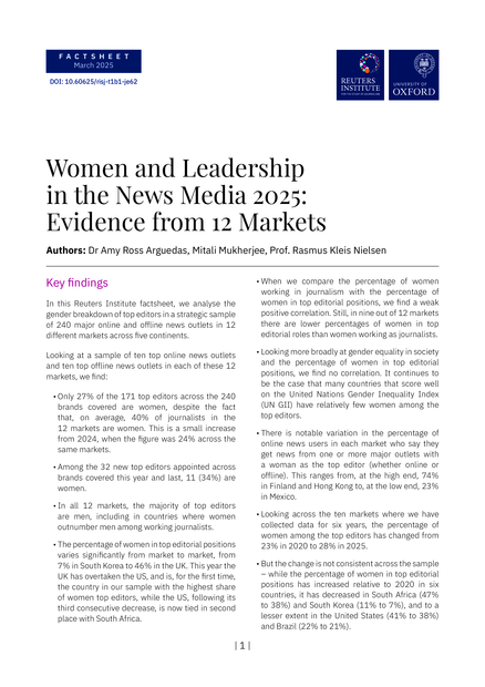 Women and Leadership in the News Media 2025: Evidence from 12 Markets