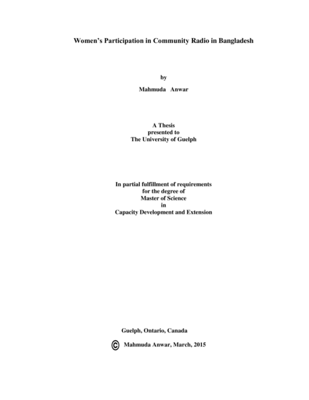"This study is about women‘s engagement in community radio (CR) in Bangladesh which is a relatively new innovation in the country. The thesis seeks to describe the current situation of how CR facilitates women‘s access to and participation in media content, organizational structure, and media facilities. The analysis focuses on various levels of women‘s participation as listeners, programmers and managers in community media. Methods used in the study include key informant interviews, semi-structured interviews, and observation. Community radio creates interest among women listeners in communities by using local content in local languages as well as providing opportunities for women to be involved with local media. The study finds however, that women are not participating at a level where they can manage communication processes or use their own knowledge and resources. The study concludes that in order to sustain community media, women need to be recognized and involved as an important part of the community. This study supports that women want to own their communication processes through developing their capacity in community radio." (Abstract)