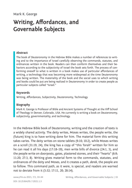 "The book of Deuteronomy in the Hebrew Bible makes a number of references to writing and to the importance of Israel carefully observing the commands, statutes, and ordinances written in the book. Readers can then conform themselves and their behaviors according to the subjectivity of Israel the book sets forth. The process of conforming oneself to what is written in a book makes use of particular affordances of writing, a technology that was becoming more widespread at the time Deuteronomy was being written. The materiality of the book and the social uses to which writing and books could be put are being realized in Deuteronomy in order to create people as particular subjects called “Israel.” (Abstract)