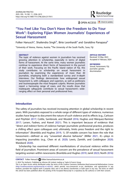 "The topic of violence against women in journalism has received growing attention in scholarship, especially in terms of digital forms of harassment. At the same time, many women journalists continue to experience direct forms of harassment in the pursuit of their work. Focusing on the Pacific Island nation of Fiji, this study contributes to scholarship on sexual harassment in journalism by examining the experiences of more than 40 journalists, employing both a standardized survey and in-depth interviews. Our findings demonstrate how widespread sexual harassment is, with colleagues and superiors, as well as politicians and businesspeople the most frequent culprits. Women journalists report a harrowing range of cases, and the results show that inadequate safeguards contribute to sexual harassment’s wide-ranging effect on their personal and professional lives." (Abstract)