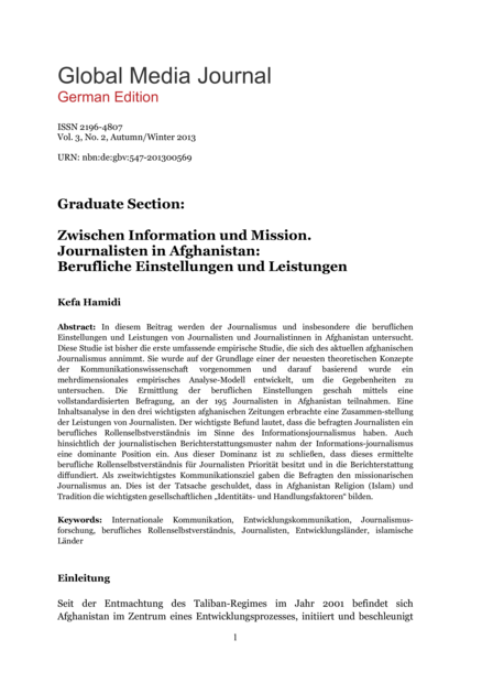 "Die Ermittlung der beruflichen Einstellungen geschah mittels einer vollstandardisierten Befragung, an der 195 Journalisten in Afghanistan teilnahmen. Eine Inhaltsanalyse in den drei wichtigsten afghanischen Zeitungen erbrachte eine Zusammenstellung der Leistungen von Journalisten. Der wichtigste Befund lautet, dass die befragten Journalisten ein berufliches Rollenselbstverständnis im Sinne des Informationsjournalismus haben [...] Als zweitwichtigstes Kommunikationsziel gaben die Befragten den missionarischen Journalismus an. Dies ist der Tatsache geschuldet, dass in Afghanistan Religion (Islam) und Tradition die wichtigsten gesellschaftlichen „Identitäts- und Handlungsfaktoren“ bilden." (Abstract)