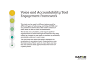 "This tool can be used in different places and for different types of advocacy, and helps CAFOD and our partners to think about the wider context of their work as well as their achievements. The levels are cumulative, and require partner organisations to think through the reasons why they might be c