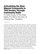 "This study examines the social consequences of an ethnic migrant community radio station, Map Radio FM 99, to explore its role for the Shan migrant community in Chiang Mai, Thailand. Fieldwork was conducted for seven weeks between December 2015 and January 2016 to collect data using semi-structured