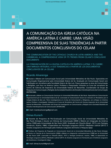 "O presente artigo tem por tema a comunicação da e na Igreja Católica na América Latina e Caribe, e, por objeto de estudo, os Documentos Conclusivos das cinco Conferências Gerais realizadas pelo CELAM. Desta forma, o objetivo central é compreender as principais tendências comunicacionais da instituição no território. O percurso metodológico do trabalho forma-se a partir da Hermenêutica de Profundidade e tem como marco teórico os estudos de autores e autoras majoritariamentelatino-americanos, na perspectiva das Epistemologias do Sul. O artigo sugere a coexistência de ao menos três tendências comunicacionais na instituição." (Resumo)