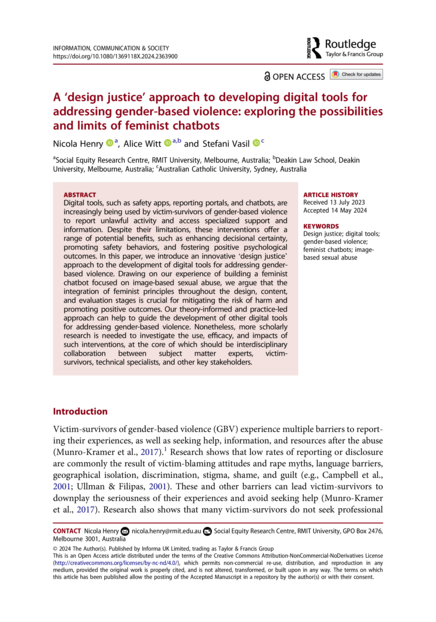 "Digital tools, such as safety apps, reporting portals, and chatbots, are increasingly being used by victim-survivors of gender-based violence to report unlawful activity and access specialized support and information. Despite their limitations, these interventions offer a range of potential benefits, such as enhancing decisional certainty, promoting safety behaviors, and fostering positive psychological outcomes. In this paper, we introduce an innovative ‘design justice’ approach to the development of digital tools for addressing genderbased violence. Drawing on our experience of building a feminist chatbot focused on image-based sexual abuse, we argue that the integration of feminist principles throughout the design, content, and evaluation stages is crucial for mitigating the risk of harm and promoting positive outcomes. Our theory-informed and practice-led approach can help to guide the development of other digital tools for addressing gender-based violence. Nonetheless, more scholarly research is needed to investigate the use, efficacy, and impacts of such interventions, at the core of which should be interdisciplinary collaboration between subject matter experts, victimsurvivors, technical specialists, and other key stakeholders." (Abstract)