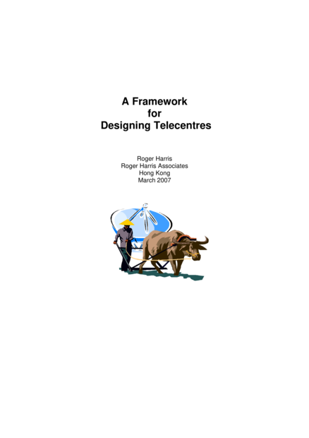 "This Framework is organised in the sequence of a logical approach to the design of information systems that are intended to deliver socio-economic benefits via Telecentres for the purpose of community level development and poverty reduction. Telecentres are promoted as an answer to the problems of the digital divide, whereby large sections of society do not enjoy access to Information and Communication Technologies (ICTs) and are seen to be excluded from the socio-economic benefits that such access brings. By providing shared, community-based access to ICTs, Telecentres help to overcome this disparity. However, this framework for designing Telecentres is based on the understanding that whilst access to ICTs is important, of itself, it is insufficient. Telecentres should be capable of making use of ICTs in a way that delivers tangible benefits to their communities, and are therefore tools for development rather than an end in themselves. The Framework therefore provides a guide for implementing local development with the use of ICTs, in the form of a Telecentre. The audience for this Framework is the institutions or individuals involved in, or contemplating, the setting up of Telecentres. In such a process, the technology is not the objective, the development outcomes are. Accordingly, these are identified at the outset, and then expressed in terms of improved information flows, partnership relationships and choices of technology, which are finally realised through the implementation, operation and ultimately evaluation of the Telecentre." (Introduction, page 4)