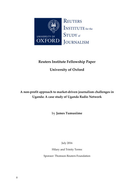 "In this study I set out to investigate whether non-profit journalism models, particularly URN, provide an effective bulwark against the challenges associated with market-driven journalism in Uganda's hostile socio-economic and political landscape. The study further sought to establish whether URN can be considered a viable and sustainable journalism model that can be replicated. The unfolding collapse of traditional media models has given rise to outside-the-box innovations as the industry bids to not only survive but also safeguard journalism, and this has partly inspired the proliferation of non-profit outfits. While the US leads the way, non-profit organisations are becoming popular across the world.