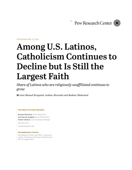 Among U.S. Latinos, Catholicism Continues to Decline, But is Still the Largest Faith