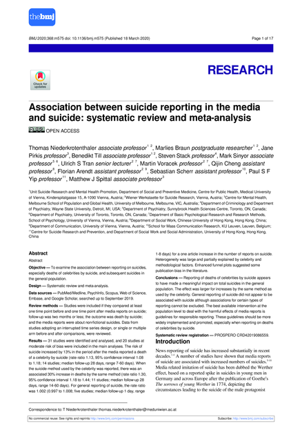 "In this large and up-to-date systematic review and meta-analysis, we looked at the impact of suicide reports in news and information media on subsequent numbers of suicides. Our results support the continued use and promotion of guidelines on responsible media reporting of suicide, which are the best available interventions to address and prevent imitation effects in the population. Collaboration between suicide prevention experts and media professionals in implementing these guidelines is an essential part of any suicide prevention strategy. Caution should be exercised in reporting suicides by celebrities in particular. The media will continue to report on newsworthy suicides but have a social responsibility to mitigate the likelihood of the Werther effect." (Conclusions, page 7)