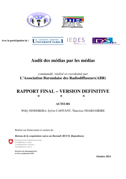 Bujumbura; Paris: Association Burundaise des Radiodiffuseurs (ABR);Université Paris, Institut d’étude du développement économique et social (IEDES) (2013), 168 pp.