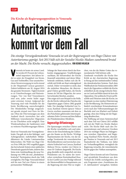 "Die einstige Vorzeigedemokratie Venezuela ist seit der Regierungszeit von Hugo Chávez von Autoritarismus geprägt. Seit 2013 hält sich der Sozialist Nicolás Maduro zunehmend brutal an der Macht. Die Kirche versucht, dagegenzuhalten." (Einleitung)