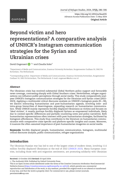 "The Ukrainian crisis has received substantial Global Northern policy support and favourable news coverage, contrasting sharply with Global Southern crises. Nevertheless, refugee organizations can influence public perceptions through social media. This study comparatively analyses UNHCR’s Instagram communication strategies for the Ukrainian and Syrian crises (2022–2023). Applying a multimodal critical discourse analysis on UNHCR’s Instagram posts (N=90), we discern interacting humanitarian and post-humanitarian appeals, involving inter- and intra-group hierarchies of deservingness, expanding research on humanitarian communication. While UNHCR mainly represents forcibly displaced Ukrainians as victims and focuses on ‘ideal victims’, it mostly portrays forcibly displaced Syrians as empowered individuals, likely due to context-specific differences and partially countering news and policy narratives. Both humanitarian representations often intersect with post-humanitarian strategies, facilitated by Instagram affordances. This study thus contributes to the literature on humanitarian communication with comparative crisis-specific and platform-specific insights and causes. Moreover, it nuances the often-assumed importance of post-humanitarian imageries on social media." (Abstract)