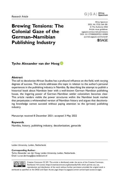 "The call to decolonize African Studies has a profound influence on the field, with varying degrees of success. This article addresses this topic in relation to the author’s personal experiences in the publishing industry in Namibia. By describing the attempt to publish a historical book about Namibian beer with a well-known German–Namibian publishing house, the lingering power of German–Namibian settler colonialism becomes clear. This article renders visible the power structures within the Namibian book market that perpetuates a whitewashed version of Namibian history and argues that decolonizing knowledge cannot succeed without paying attention to the (private) publishing industry." (Abstract)