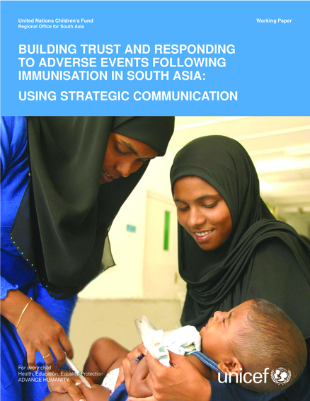 "To develop communication capacity specifically around adverse events following immunisation (AEFI), the UNICEF Regional Office for South Asia (ROSA) and the WHO Regional Office for South-East Asia (SEARO) organized a joint regional workshop "Strategic Communication: Building Trust and Responding to Adverse Events Following Immunisation in South Asia", in New Delhi from 9 to 10 August 2004. This working paper synthesises the presentations and debates from the workshop." (Foreword)