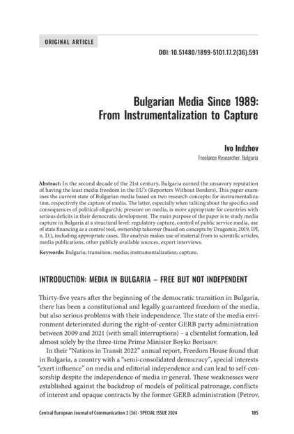 "In the second decade of the 21st century, Bulgaria earned the unsavory reputation of having the least media freedom in the EU’s (Reporters Without Borders). This paper examines the current state of Bulgarian media based on two research concepts: for instrumentalization, respectively the capture of media. The latter, especially when talking about the specifics and consequences of political-oligarchic pressure on media, is more appropriate for countries with serious deficits in their democratic development. The main purpose of the paper is to study media capture in Bulgaria at a structural level: regulatory capture, control of public service media, use of state financing as a control tool, ownership takeover (based on concepts by Dragomir, 2019, IPI, n. D.), including appropriate cases. The analysis makes use of material from to scientific articles, media publications, other publicly available sources, expert interviews." (Abstract)