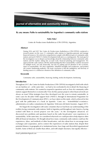 "During 2016 and 2017 the Centro de Producciones Radiofónicas (CPR-CEPPAS) conducted a research project on the ways 11 community radio stations in Argentina generate and manage financial resources. We selected a comprehensive sample with different types of community radio stations and used UNESCO's Media Development Indicators as a starting point. The main goal of the investigation was to deepen our knowledge about the relationship between community radio stations and the market, taking into account work, financial planning and management. We approached the radio stations with the understanding that their sustainability could be measured on multiple levels, not only financially, but also by putting special attention to the economic aspect of sustainability. We draw regularities, identified strengths and weaknesses, and pointed out creative fundraising methods. Our main conclusion is that the multiplicity and diversity of funding sources is a distinctive element of the definition of community radio." (Abstract)