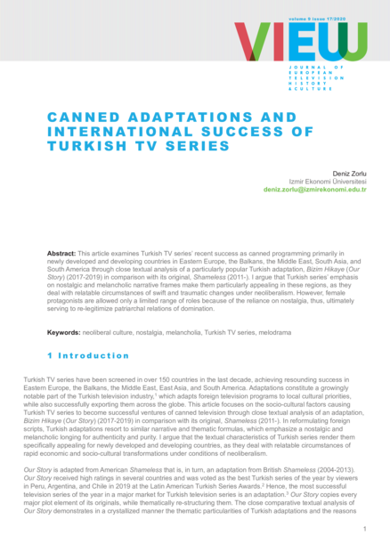 "This article examines Turkish TV series’ recent success as canned programming primarily in newly developed and developing countries in Eastern Europe, the Balkans, the Middle East, South Asia, and South America through close textual analysis of a particularly popular Turkish adaptation, Bizim Hikaye (Our Story) (2017-2019) in comparison with its original, Shameless (2011-). I argue that Turkish series’ emphasis on nostalgic and melancholic narrative frames make them particularly appealing in these regions, as they deal with relatable circumstances of swift and traumatic changes under neoliberalism. However, female protagonists are allowed only a limited range of roles because of the reliance on nostalgia, thus, ultimately serving to re-legitimize patriarchal relations of domination." (Abstract)
