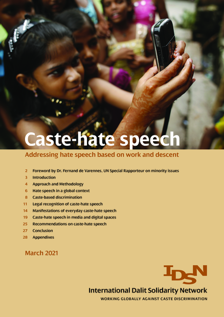 "Caste discrimination remains one of the world’s most serious human rights issues. It is intrinsically linked with hate speech, but as this report has demonstrated, insufficient attention has been paid to the caste-based aspects of hate speech. All too often, caste-hate speech is allowed to continue unchecked, not least on social media platforms. Campaigners against caste discrimination rightly argue that unless caste is specifically mentioned in the human rights discourse instead of being “hidden” under other headlines, there is a huge risk that the issue will be ignored. This warning also applies to caste-hate speech. Consequently, it is essential that caste-hate speech is recognised as a protected characteristic in international covenants – and as a distinctive form of hate speech – and that Dalits are included in actions to mitigate caste-hate speech online and offline, at every level. Anything less will enable abusers to continue practising this form of hate speech – and condemn Dalits and other groups to even more abuse and violence." (Conclusion)