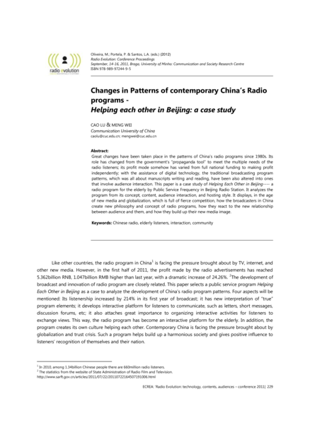 "Great changes have been taken place in the patterns of China’s radio programs since 1980s. Its role has changed from the government’s “propaganda tool” to meet the multiple needs of the radio listeners; its profit mode somehow has varied from full national funding to making profit independently; with the assistance of digital technology, the traditional broadcasting program patterns, which was all about manuscripts writing and reading, have been also altered into ones that involve audience interaction. This paper is a case study of 'Helping Each Other in Beijing', a radio program for the elderly by Public Service Frequency in Beijing Radio Station. It analyzes the program from its concept, content, audience interaction, and hosting style. It displays, in the age of new media and globalization, which is full of fierce competition, how the broadcasters in China create new philosophy and concept of radio programs, how they react to the new relationship between audience and them, and how they build up their new media image." (Abstract)