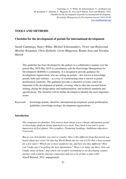 "This guideline has been developed by the authors in a collaborative manner over the period May 2018-May 2019 in consultation with the Knowledge Management for Development (KM4Dev) community. It is designed to provide guidance for development organizations who are setting up portals –also known as knowledge portals, hubs and websites– as a way of counteracting what is known as portal proliferation syndrome. The guideline provides a checklist of issues which are important in the development of portals, covering what to take into account before starting, during the design phase and implementation, and technical standards and specifications. The checklist will be further developed to identify the most important issues." (Page 83)