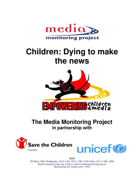 "This report presents the results and findings of the Empowering Children & Media project, in which the MMP monitored the representation of children in the news media over a three-month period in 2003. It also aims to form part of a larger project to improve the representation of children in the media, by providing a base from which further research can be conducted and by providing material from which strategies can be developed and implemented in media settings to be used by journalists and media workers." (Page 3)