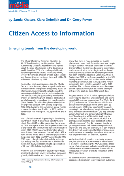 "Our approach is based on an understanding of access to information as a composite measure of access to source/s or platform, exposure, evaluation, content and self-reported differences in citizens’ reporting of the impact of their use of Information, Communication and Media (ICM) resources (Power, Khatun and Debeljak 2011). The data that were used to test this approach were collected within InterMedia’s AudienceScapes research initiative, which was co-funded by the Bill and Melinda Gates Foundation, and aimed to improve development outcomes through knowledge sharing and dissemination of research and analysis in a user-friendly format (see www.audiencescapes.org). Within the initiative, InterMedia conducted nationally representative surveys in Kenya, Ghana, Zambia and Tanzania, which focused on how the general population in all four countries obtains, shares and uses information on development related issues. The analysis provided insights into understanding citizen’s access to information in a number of key development areas, such as education, health, governance, agriculture and personal finance, and enabled the InterMedia team to examine our approach to ICM resources and the five dimensions of “Citizen Access to Information”, discussed here. In this article we use examples from these four studies to demonstrate the variation in citizen access to information in developing countries, and illustrate the proposed dimensions and sub-dimensions of our approach." (Pages 19-20)