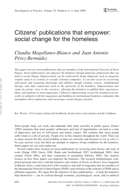 "This paper surveys street publications that are members of the International Network of Street Papers. Street publications can empower the homeless though numerous endeavours that can lead to social change. Empowerment can be achieved by being employed, such as magazine vendors and/or as workers in socially oriented companies. It can also occur by recovering self-esteem and acquiring knowledge and abilities though training courses, rehabilitation therapy, and other endeavours such as the university of the homeless. Empowerment also comes by giving ‘voice to the voiceless’, allowing the homeless to publish their experiences, ideas, and opinions in street magazines. Collective empowerment occurs by creating local networks in solidarity with the magazines and building an international homeless community that strengthens these endeavours and encourages social-change activities." (Abstract)