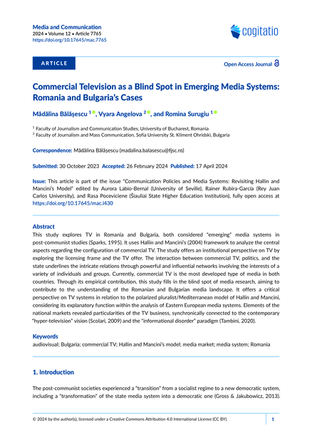 "This study explores TV in Romania and Bulgaria, both considered "emerging" media systems in post-communist studies (Sparks, 1995). It uses Hallin and Mancini's (2004) framework to analyze the central aspects regarding the configuration of commercial TV. The study offers an institutional perspective on TV by exploring the licensing frame and the TV offer. The interaction between commercial TV, politics, and the state underlines the intricate relations through powerful and influential networks involving the interests of a variety of individuals and groups. Currently, commercial TV is the most developed type of media in both countries. Through its empirical contribution, this study fills in the blind spot of media research, aiming to contribute to the understanding of the Romanian and Bulgarian media landscape. It offers a critical perspective on TV systems in relation to the polarized pluralist/Mediterranean model of Hallin and Mancini, considering its explanatory function within the analysis of Eastern European media systems. Elements of the national markets revealed particularities of the TV business, synchronically connected to the contemporary"hyper-television" vision (Scolari, 2009) and the "informational disorder" paradigm (Tambini, 2020)."(Absract)