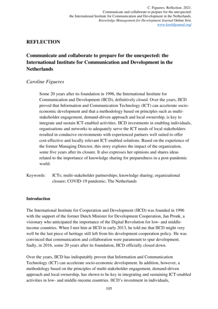 "20 years after its foundation in 1996, IICD, the International Institute for Communication and Development, definitively closed. Over the years, IICD proved that Information and Communication Technology (ICT) can accelerate socio-economic development and that a methodology based on principles such as multi-stakeholder engagement, demand-driven approach and local ownership, is key to integrate and sustain ICT-enabled activities. IICD investments in enabling individuals, organisations and networks to adequately serve the ICT needs of local stakeholders resulted in conducive environments with experienced partners well suited to offer cost-effective and locally relevant ICT-enabled solutions. Based on the experience of the writer this paper explores the impact of the organization, after five years in a fast changing environement. It also expresses her opinions and shares ideas related to the importance of knowledge sharing for preparedness in a post-pandemic world." (Abstract)
