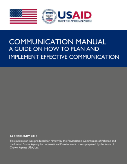 "This communication manual provides guidance and advice on how to carry out information and publicity activities by the Privatisation Commission of Pakistan. The manual [...] provides advice on communication planning, event management including information dissemination and outreach to both traditional and digital media. This manual should be used by every staff member, who is directly involved in the development, delivery and management of the Privatisation program. By using this communication guide, Privatisation Commission staff members will be able to carry out communication in a strategic manner, which will actively and openly promote the activities and results of the Privatisation program." (Page 2)