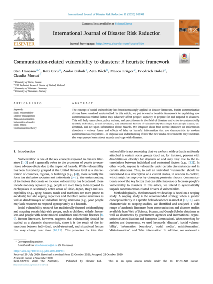 "The concept of social vulnerability has been increasingly applied in disaster literature, but its communicative drivers have remained understudied. In this article, we put forward a heuristic framework for explaining how communication-related factors may adversely affect people’s capacity to prepare for and respond to disasters. This will help researchers, policy makers, and practitioners in the field of disasters and crises to systematically identify individual, social-structural, and situational factors of vulnerability that shape how people access, understand, and act upon information about hazards. We integrate ideas from recent literature on information disorders – various forms and effects of false or harmful information that are characteristic to modern communication ecosystems – to improve our understanding of how the new media environments may transform the ways people learn about hazards and cope with disasters." (Abstract)