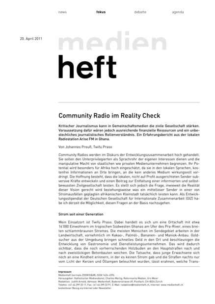 "Kritischer Journalismus kann in Gemeinschaftsmedien die zivile Gesellschaft stärken. Voraussetzung dafür wären jedoch ausreichende finanzielle Ressourcen und ein unbestechliches journalistisches Rollenverständnis. Ein Erfahrungsbericht aus der lokalen Radiostation Arise FM in Ghana." (Einleitung)