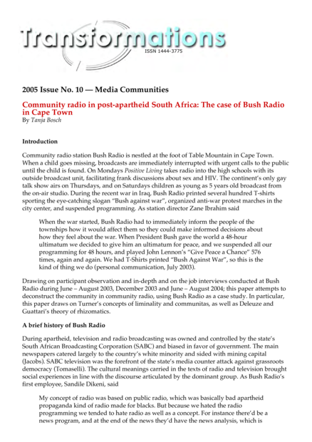 Community Radio in Post-Apartheid South Africa: The Case of Bush Radio in Cape Town