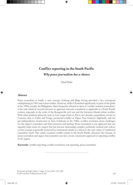 "Peace journalism is hardly a new concept, Galtung and Ruge having provided a key conceptual underpinning in 1965 and in later studies. However, while it flourished significantly in parts of the globe in the 1990s, notably the Philippines, albeit frequently referred to there as ‘conflict-sensitive journalism’, it has only relatively recently become an approach seriously considered as applicable in a South Pacific context, especially in the wake of the Bougainville civil war and the Solomon Islands ethnic conflict. With other political upheavals such as four coups d’état in Fiji in two decades, paramilitary revolts in Vanuatu, riots in Tahiti and Tonga, protracted conflict in Papua New Guinea’s Highlands, and the pro-independence insurrection in New Caledonia in the 1980s, conflict resolution poses challenges for the region’s journalists and their education and training. Peace journalism is one approach that can arguably make sense of a region that has become increasingly complex, politically strained and violent, yet the concept is generally eschewed by mainstream media as a threat to the core values of ‘traditional journalism’ itself. This article examines conflict trends in the South Pacific, discusses the concept of peace journalism and argues that journalists can take a more constructive approach to reporting conflict in the region. (Abstract)