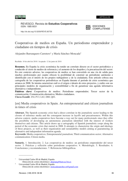 "En España la crisis económica ha tenido un correlato directo en el sector periodístico y conducido al cierre de medios de referencia y al aumento de los despidos y la precarización del sector. En este contexto adverso, las cooperativas de medios se han convertido en una vía de salida para muchos profesionales por cuanto ofrecen la posibilidad de construir un periodismo autónomo e identificado con el interés de los propios trabajadores y de la ciudadanía. Este artículo esboza una cartografía de las cooperativas periodísticas en España durante el período de crisis económica que arranca en 2008. Se intenta caracterizar cuál es el origen e ideario de estos proyectos, y cuáles son sus principales modelos de organización y sostenibilidad a fin de garantizar una agenda informativa alternativa e independiente." (Resumen)