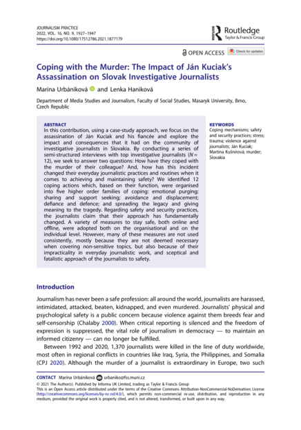 "In this contribution, using a case-study approach, we focus on the assassination of Ján Kuciak and his fiancée and explore the impact and consequences that it had on the community of investigative journalists in Slovakia. By conducting a series of semi-structured interviews with top investigative journalists (N = 12), we seek to answer two questions: How have they coped with the murder of their colleague? And, how has this incident changed their everyday journalistic practices and routines when it comes to achieving and maintaining safety? We identified 12 coping actions which, based on their function, were organised into five higher order families of coping: emotional purging; sharing and support seeking; avoidance and displacement; defiance and defence; and spreading the legacy and giving meaning to the tragedy. Regarding safety and security practices, the journalists claim that their approach has fundamentally changed. A variety of measures to stay safe, both online and offline, were adopted both on the organisational and on the individual level. However, many of these measures are not used consistently, mostly because they are not deemed necessary when covering non-sensitive topics, but also because of their impracticality in everyday journalistic work, and sceptical and fatalistic approach of the journalists to safety." (Abstract)