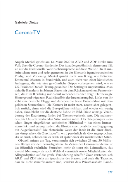 "Schaut man sich die Beispiele des Umgangs mit Corona in den drei behandelten Fernsehformaten – Nachrichten, fiktive Erzählgenres und Corona-Miniserien – an, fällt eine seltsame Ausweichbewegung auf, auch dann, wenn die Pandemie selbst das Thema ist. In den Nachrichten wird die Krankheit durch industrielle, menschenleere Bildarrangements erzählt, im Reich der Serien und Feature-Filme wird sie gleich ganz verschwiegen, und das Nischen-TV der experimentellen Corona-Miniserien zieht sich auf eine Dramedy mit komischer Heldin zurück. In der Erzähltheorie spricht man davon, dass nur mögliche Leben (possible lives) erzählt werden können, weil lediglich im Rahmen der eigenen Kultur und ihrer Vergangenheit ein Verständnis erzeugt werden könne. Dementsprechend scheint im derzeitigen Deutschland auch die Pandemie an die Grenzen der Erzählbarkeit zu stoßen. Covid-19 ist zwar nicht die erste Seuche, die das Abendland heimgesucht hat und erzählt wurde – man denke an die Pest, die Cholera, die spanische Grippe und AIDS –, sie ist aber die erste, die gleichzeitig global verbreitet ist, globalisierte Regime und Abwehrstrategien verlangt und – welch eine Kränkung! – in den demokratischen Nationen schwerer unter Kontrolle zu bringen ist als in einigen autoritären Regimen. Das kulturelle Selbstbewusstsein des Globalen Nordens verlangt, »Herr der Lage« zu sein. Wenn das nicht möglich ist, müssen wenigstens die Opfer unsichtbar bleiben. In den Unterhaltungsgenres, in denen vom besseren Leben geträumt wird und wo das (oft nur zwischenzeitliche) Liebes-Happyend alles wieder gut macht, hat Corona mit seiner Todesdrohung und seiner Berührungslosigkeit keinen Platz. Nur in einem Nischengenre wird ausprobiert, wie ein Leben mit Gesicht, Körper und Corona erzählt werden könnte." (Epilog, Seite 285)