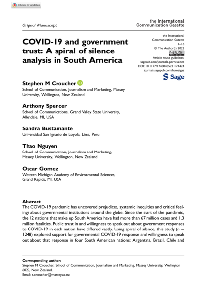 "The COVID-19 pandemic has uncovered prejudices, systemic inequities and critical feelings about governmental institutions around the globe. Since the start of the pandemic, the 12 nations that make up South America have had more than 67 million cases and 1.3 million fatalities. Public trust in and willingness to speak out about government responses to COVID-19 in each nation have differed vastly. Using spiral of silence, this study (n =1248) explored support for governmental COVID-19 response and willingness to speak out about that response in four South American nations: Argentina, Brazil, Chile and Peru. Results revealed Chileans are more likely to speak out on government response to COVID-19 than other South American participants. In addition, climate of opinion and support for government response positively predict willingness to speak. These results further our international and cross-cultural understanding of spiral of silence." (Abstract)