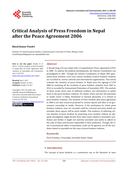 Critical Analysis of Press Freedom in Nepal after the Peace Agreement 2006