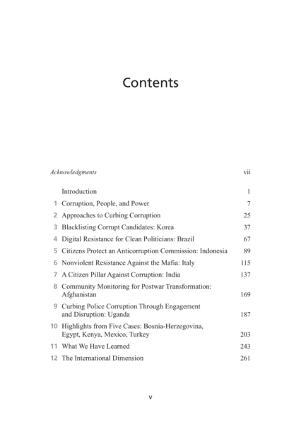 "Campaigns and movements targeting corruption often face decentralized targets rather than an identifiable dictator or external government, and can be found both in undemocratic and democratic systems. Graft and abuse are manifested in a systemic manner rather than a hodgepodge collection of illicit transactions. Consequently, this research brings to light new applications of civil resistance beyond the more commonly known cases against occupations, such as the Indian independence movement, and authoritarian regimes from Chile to Poland. It also expands our understanding about the dynamics of how people collectively wield nonviolent power for the common good. The focus of this research is on citizen agency: what civic actors and regular people—organized together and exerting their collective power—are doing to curb corruption as they define and experience it. Hence, the analytical framework is based on the skills, strategies, objectives, and demands of such initiatives, rather than on the phenomenon of corruption itself, which has been judiciously studied for more than two decades by scholars and practitioners from the anticorruption and development realms. I selected cases that met the following criteria: they were “popular” initiatives. They were civilian-based, involved grassroots participation, and were led and implemented by individuals from the civic realm, rather than governments or external actors, such as donors, development institutions, and international nongovernmental organizations (INGOs); they were nonviolent. They did not threaten or use violence to further their aims; they involved some degree of organization and planning, which varied depending on the scope—objectives, geographical range, duration—of the civic initiative; multiple nonviolent actions were employed (thus, instances of one-off demonstrations or spontaneous protests were not considered); objectives and demands were articulated; the civic initiative was sustained over a period of time." (Introduction, pages 2-3)