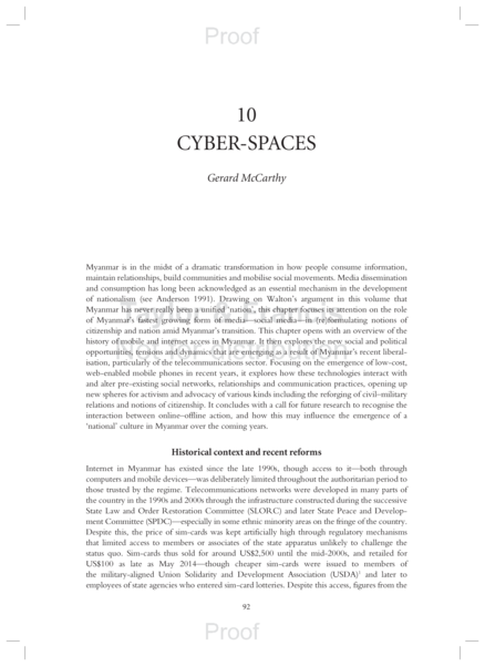 "This chapter focuses on the role of Myanmar's fastest growing form of media—social media—in formulating notions of citizenship and nation amid Myanmar's transition. It begins with an overview of the history of mobile and internet access in Myanmar. The chapter explores the new social and political opportunities, tensions and dynamics that are emerging as a result of Myanmar's liberalisation, particularly of the telecommunications sector. It explains how the technologies interact with and alter pre-existing social networks, relationships and communication practices, opening up new spheres for activism and advocacy of various kinds including the reforging of civil-military relations and notions of citizenship. The chapter discusses a call for future research to recognise the interaction between online-offline action, and how this may influence the emergence of a 'national' culture in Myanmar. In addition to enabling civilian humanitarian action, cyber-space has also become one of the primary domains through which civil-military relations are being reforged after decades of authoritarian rule." (Abstract)