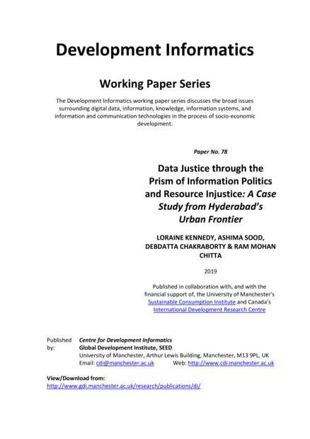 "How does data visibility affect vulnerable communities that face uncertainty over occupational rights? Or in other words, can data justice be realized in settings of acute resource injustice? These are the overarching questions that our case study interrogates by opening up the black box of the community in the volatile and fast-transforming context of occupation rights on the peri-urban frontier. We examine the unfolding of data and information processes through the lens of enumeration and community mapping exercises conducted in a low-income neighbourhood or basti located in the fast-transforming peri-urban fringe of Hyderabad, India. We argue that the realization of data justice is mediated by ‘information politics’, i.e., the ways in which informational resources, as well as the risks and rewards associated with them, are distributed across individual actors and identity groups within the community. In so doing, our case study underlines the importance of a structural understanding of data justice and also suggests directions for embedding justice in data processes." (Abstract)