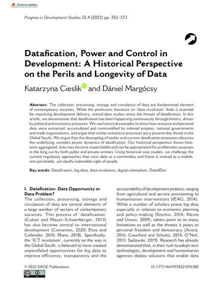 "The collection, processing, storage and circulation of data are fundamental element of contemporary societies. While the positivistic literature on ‘data revolution’ finds it essential for improving development delivery, critical data studies stress the threats of datafication. In this article, we demonstrate that datafication has been happening continuously through history, driven by political and economic pressures. We use historical examples to show how resource and personal data were extracted, accumulated and commodified by colonial empires, national governments and trade organizations, and argue that similar extractive processes are a present-day threat in the Global South. We argue that the decoupling of earlier and current datafication processes obscures the underlying, complex power dynamics of datafication. Our historical perspective shows how, once aggregated, data may become imperishable and can be appropriated for problematic purposes in the long run by both public and private entities. Using historical case studies, we challenge the current regulatory approaches that view data as a commodity and frame it instead as a mobile, non-perishable, yet ideally inalienable right of people." (Abstract)