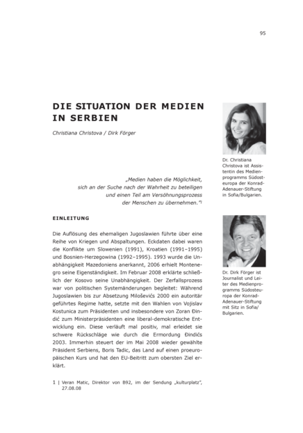 "Die Lage der Medien in Serbien ist trotz positiver Tendenzen in jüngster Zeit keineswegs befriedigend. Nach dem Fall des Kommunismus und dem Auseinanderbrechen des ehemaligen Jugoslawien folgten in der Region Kriege, Abspaltungen und erbitterte ethnische Konflikte. Der aggressive Nationalismus Miloševics fand sein Echo bei den weitgehend vom Regime kontrollierten Medien. Erst mit Kostunica und Ðindic begann im Jahr 2000 der noch unsichere Weg in Richtung einer vielfältigen, unabhängigen und pluralistischen serbischen Medienlandschaft. Inzwischen ist manches erreicht, doch es bleiben Defizite: Die demokratische Entwicklung insgesamt bedarf der Konsolidierung. Die Unabhängigkeit der Medien vom Staatshaushalt müsste gesichert, die Freiheit journalistischer Tätigkeit garantiert werden. Unklarer, teils illegaler Medienbesitz müsste erhellt, der Einfluss alter Eliten eingedämmt werden. Positiv ist, dass sich viele Medien in Serbien heute durch die Opposition zum „alten Regime” definieren. Ein solch demokratisches Wertebekenntnis ist viel wert." (Zusammenfassung)
