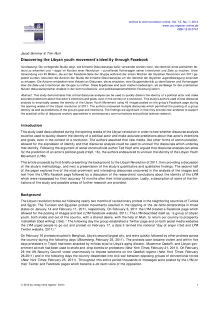 "This study demonstrates that critical discourse analysis can be used to quickly discern the identity of a political actor and make accurate predictions about that actor’s intentions and goals, even in the context of a revolution. This study’s authors used critical discourse analysis to empirically assess the identity of the Libyan Youth Movement using 45 images posted on the group’s Facebook page during the opening weeks of the Libyan revolution of 2011. The authors uncovered multiple discourses which permitted the positing of a group identity as well as predictions of the group’s goal and intentions. The findings are significant in that they provide new evidence to support the practical utility of discourse analytic approaches in contemporary communications and political science research." (Abstract)