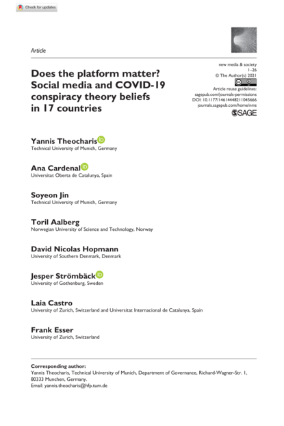 "While the role of social media in the spread of conspiracy theories has received much attention, a key deficit in previous research is the lack of distinction between different types of platforms. This study places the role of social media affordances in facilitating the spread of conspiracy beliefs at the center of its enquiry. We examine the relationship between platform use and conspiracy theory beliefs related to the COVID-19 pandemic. Relying on the concept of technological affordances, we theorize that variation across key features make some platforms more fertile places for conspiracy beliefs than others. Using data from a crossnational dataset based on a two-wave online survey conducted in 17 countries before and after the onset of the COVID-19 pandemic, we show that Twitter has a negative effect on conspiracy beliefs-as opposed to all other platforms under examination which are found to have a positive effect." (Abstract)